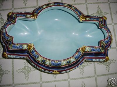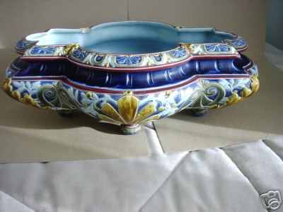 Objet No : 1038 JardinièreExiste en : Majolique Couleurs : polychromePate : majoliqueDates : ± 1880Description : jardinière sur pieds. style néo-renaissance