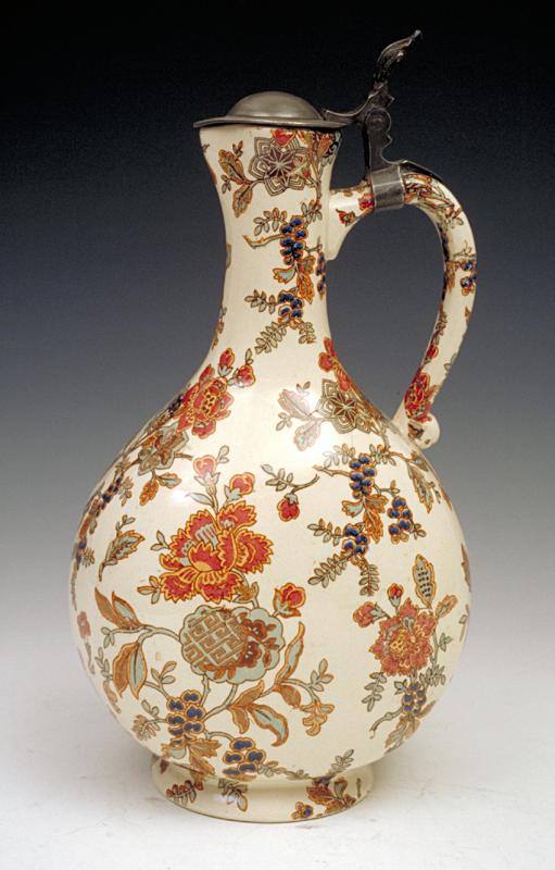 Description : bouteille à une anse à col étroit et couvercle en étain