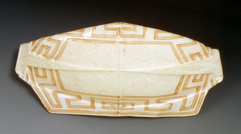 Objet No : 1446 Serviette ravierExiste en : Majolique Marques : 1 aDécors : décor de grecquesCouleurs : beigePate : faïenceDates : ± 1885
