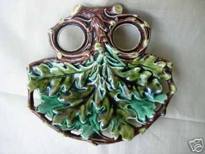 Objet No : 742 Ecritoire feuille de chêneExiste en : Majolique Marques : 1 BCouleurs : polychromePate : majoliqueDates : ± 1900Description : en forme de branche et feuille