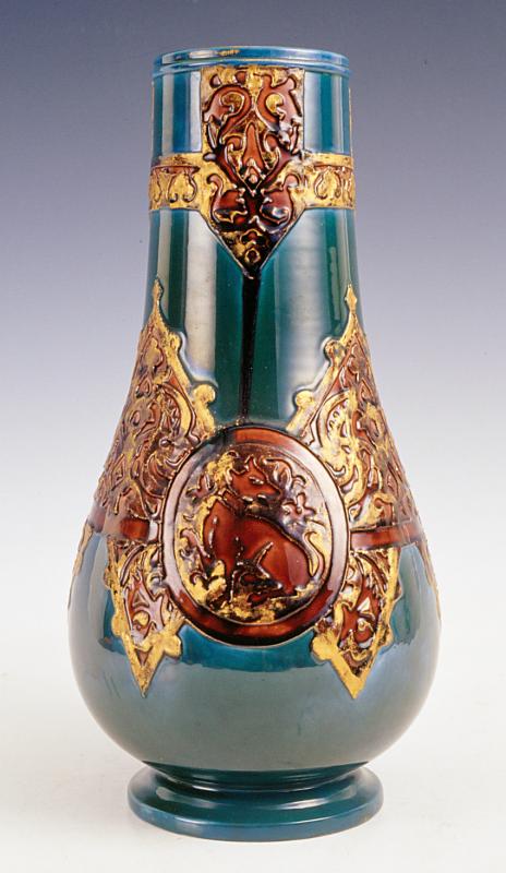 Objet No : 848 Vase flacon avec fleursExiste en : China - ModelageMarques : 1 ADécors : arabesquesCouleurs : vertPate : majoliqueDates : vers 1890